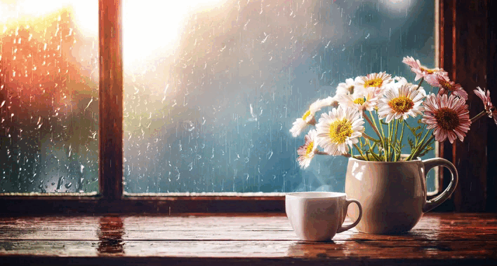 Fond d'écran animé en boucle : Bord de fenetre avec café et pluie