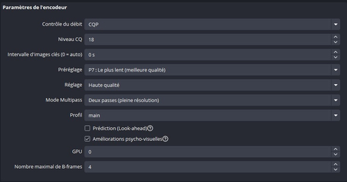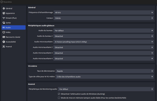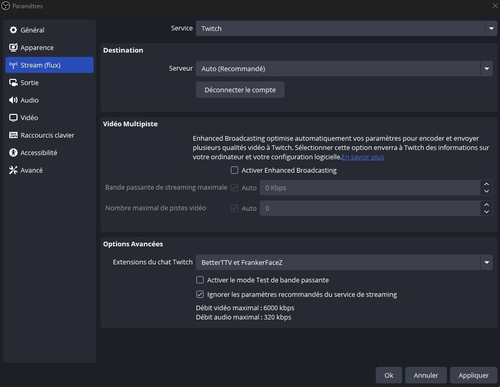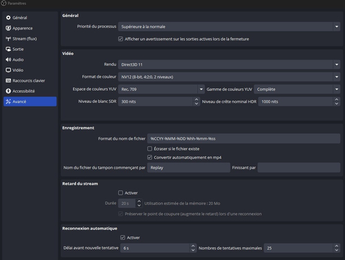 Première chose à faire télécharger et installer le logiciel OBS Studio, vous le trouverez ici : https://obsproject.com/fr/download (site officiel) Ensuite voyons ensemble les différentes pages de paramètres ! 1. Partie générale : Dans cette partie rien d'intéressant vous pouvez laisser tout comme à l'origine. 2. Apparence : ici c'est le choix du thème graphique de votre logiciel OBS. 3. Partie Stream(flux) : ici on configure le lien entre votre OBS studio et la plateforme sur laquelle vous voulez streamer. voir l'exemple ci dessous pour twitch, rien de bien compliqué juste point important à retenir : il faut cocher "ignorer les paramètres recommandés du service de streaming" (car cela bride twitch à 6000 de débit maximum et nous voulons plus pour une qualité d'image propre). une nouvelle option vient d'apparaitre dans la dernière version, c'est la "vidéo multipiste" vous pouvez l'activer seulement si vous avez une fibre 1gbps sinon laissez décoché ! 4. Partie sortie : streaming, enregistrement, audio et tampon de relecture : Ici pas mal de paramètre important, donc allons y sous onglet par sous onglets : 4.1 Partie streaming : c'est ici qu'on configure le flux du stream que vous allez envoyé à votre plateforme de streaming ! Voici une capture d'exemple pour un stream en 1080p60 avec une nvidia RTX 3070 - Piste audio j'ai mis 2 car j'utilise une piste de musique qui ne fonctionne qu'en live et est absente de toutes mes VODS, FFmpeg AAC ne pas toucher et piste de VOD twitch juste la premiere. - Encodeur video : ayant une carte nvidia j'utilise donc le nvenc de chez nvidia cela permet d'encoder le flux sur la carte graphique mais vous pouvez utiliser x264, si vous désirez encoder sur le processeur et bien sur le hw h264 si vous ave zune carte video AMD - mise à l'échelle, j'utilise le lanczos 36 échantillons pour la meilleur netteté possible. - controle du débit : CBR (constant) - débit : j'utilise 8000 (donc 8mbps d'upload) la valeur recommandées par twitch pour un stream en 1080p60 est 6000 mais en augmentant un peu on gagne en qualité - Intervalle image clé : 2 - Pré-réglage : j'utilise P6 avec une RTX 3070 peut etre descendre à p5 avec une 3060 et augmenter a fond avec une 3080, 3090 et serie 40XX - réglage : haute qualité - mode multipasse : deux passe pleine résolution (descendre à une passe pour une 3060) - profil : high - on coche amélioration psycho : pour éviter les déchirement en cas de forte mouvement - GPU : 0 - B-frames : 2 4.2 enregistrement : ici se sont les paramètres d'un enregistrement local, donc une vidéo sur votre disque dur. Donc attention quand vous streamez avec l'enregistrement activé, car il faut beaucoup d'espace disque disponible ! Personnellement je l'utilise pas, mais je vous donner un exemple de paramètres pour faire des VODS correctes et de bonne qualité pour Youtube ! La première partie est la même que pour le streaming mais pour l'encodeur je recommande ceci (voir ci-dessous) 4.3 Audio : perso j'ai tout mit en 320 mais vous pouvez descendre à 128 si vous voulez gagner un peu de marge sur le debit du flux a envoyer, mais comprennez bien qu'envoyer 8000 pour la video et 320 ou 128 pour l'audio c'est peanuts ! 4.4 tampon de relecture : perso je l'utilise pas mais si vous le désirez vous pouvez l'activer et le régler comme vous couler ce sont juste des choix préférentiels ! 5. Partie Audio : ici rien de bien compliqué on met la fréquence à 48K et les canaux en stéréo et on choisi ses périphérique audio qu'on veut utiliser dans le stream (voir exemple ci-dessous) 6. Partie vidéo : ici on paramètre la résolution du stream, seul point important à savoir ca ne sert pas à rien sur twitch de monter au dela de 1080, la plateforme n'ayant pas de debit prévu pour plus et pour les FPS 30 suffit pour un jeux avec peu de mouvement type RPG et 60 pour des FPS 7. Partie raccourcis clavier : ca c'est comme vous voulez 8. Partie accessibilité : Idem 9. Partie avancé : ici je recommande de mettre la priorité du processus en supérieure à la normale, et de choisir un profil couleur comme sur la capture ci-dessous pour un rendu de couleur au plus proche du reel : NV12, REC 709, complète. Et enfin pour finir de cocher la reconnexion automatique. Si vous avez des questions particulières sur un ou plusieurs points précis, une partie support et aide est dédiée sur ce forum ou vous pouvez la poser en réponse à ce sujet ou venir me voir sur discord !1 point